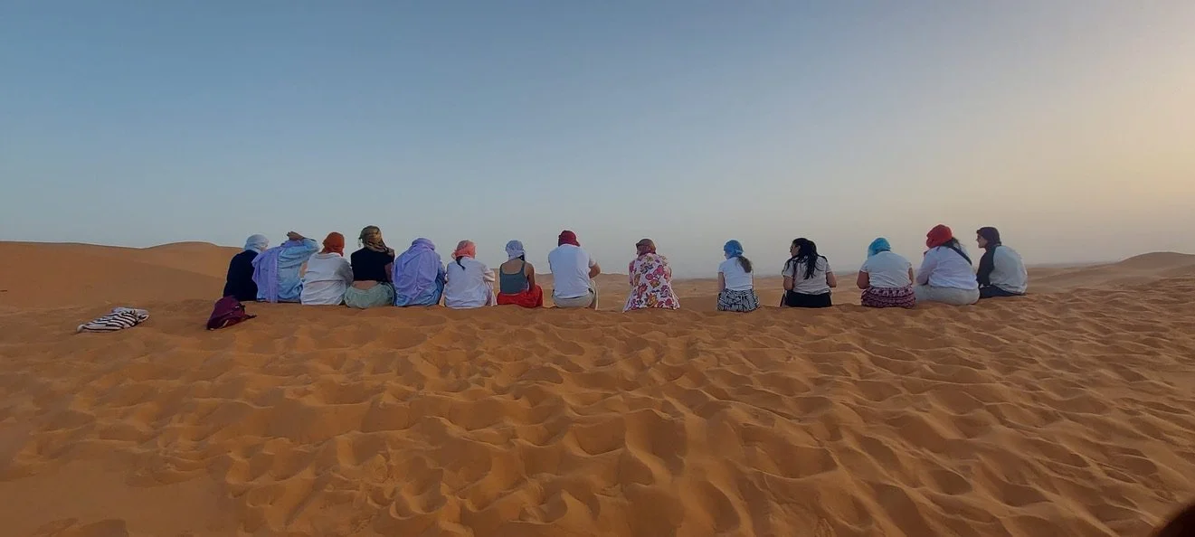 During our time in the Sahara, we didn’t just see the desert—we played in it. We rode camels, sledded down towering dunes, and raced dune buggies across the sands, grinning beneath our helmets as we flew over ripples of golden earth. One of my favorite little moments was seeing my name written in Arabic letters in the sand—a small gesture that made me feel incredibly welcomed and connected to this vast place.